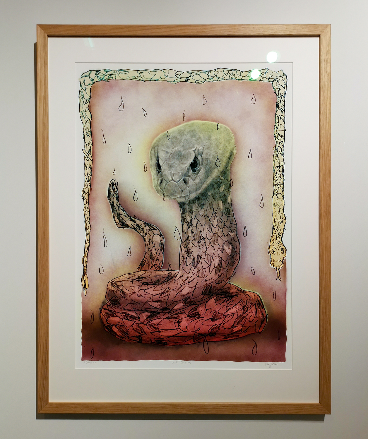 Den håndkolorerte slangen i annonsen er et eksempel. Andre slanger er farget annerledes. Man kan ikke velge slange selv. Slangen er ikke innrammet