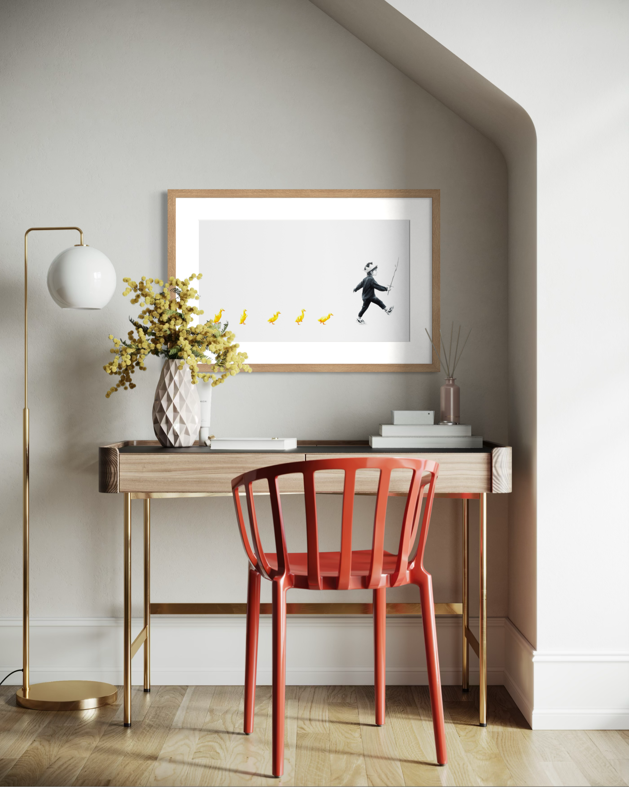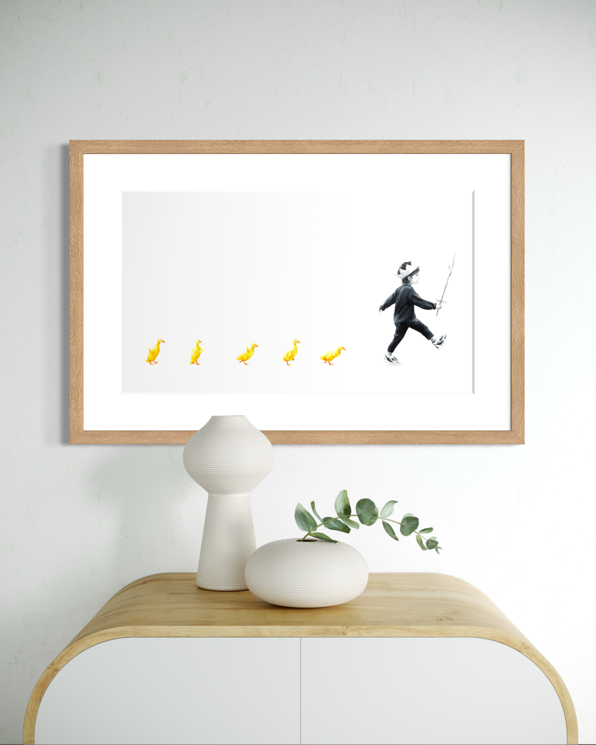 𝗙ø𝗹𝗴𝗲𝘀𝘃𝗲𝗻𝗻𝗲𝗿 er et lite nikk til barns lek og fantasi. Selv om vi ikke ser hele «verdenen» til gutten, ser vi at han har skapt sin egen historie – med små ender som faste følgesvenner. Kanskje er de soldater, kanskje drager. Det er bare fantasien som setter grenser, og det finnes mye glede i eget selskap når man ser ting på sin egen måte.